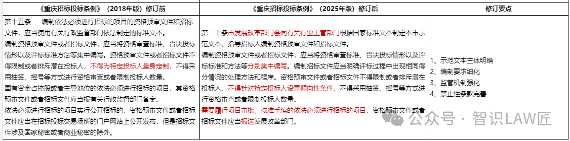 修订要点2:编制要求细化。相较于原条例,新规要求资格审查标准、否决投标情形与评标标准需"分别"集中编写,细化编写要求。