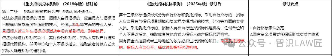 修订要点1:自行招标条件放宽。一是删除了“招标专业人员”的要求,仅保留技术、经济专业人员;二是取消了“近三年招标投标中行政、刑事处罚”的限制。