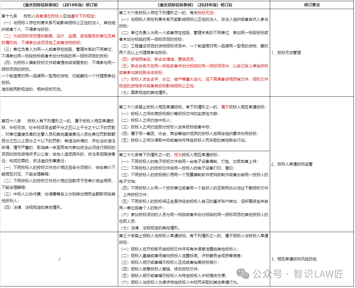 修订要点1:投标无效管理。关于投标的无效情形,新规在原条例“4+1”的基础上作了完善、删除及拓展。一是完善:对于参与投标的利害关系主体,将原”法人、其他组织或个人“,进一步明确为”法人、非法人组织或者自然人“,与《民法典》保持一致;二是删除,将原条例中的”为该招标项目提供勘察、设计、监理、咨询服务的单位及其附属机构,不得参加该项目施工或者货物投标“进行了删除。需要注意,前述删除不等同于不作限制,而是归于”国家规定的其他情形“,如《工程建设项目施工招标投标办法》第三十五条[5]即有类似规定;三是拓展,新增三种情形,分别是:(四)资格预审后,联合体增减、更换成员(联合体成员变更);(五)联合体各方在同一标段或者未划分标段的同一招标项目中,以自己名义单独投标或者参与其他联合体投标(联合体成员重复投标)。
