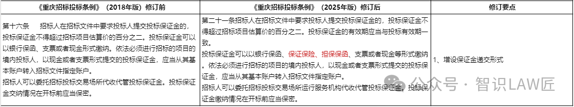 修订要点5:本次在保证保证金上限等合规要求基础上,在投标保证金的递交形式方式上增加了保证保险、担保保函两种形式。