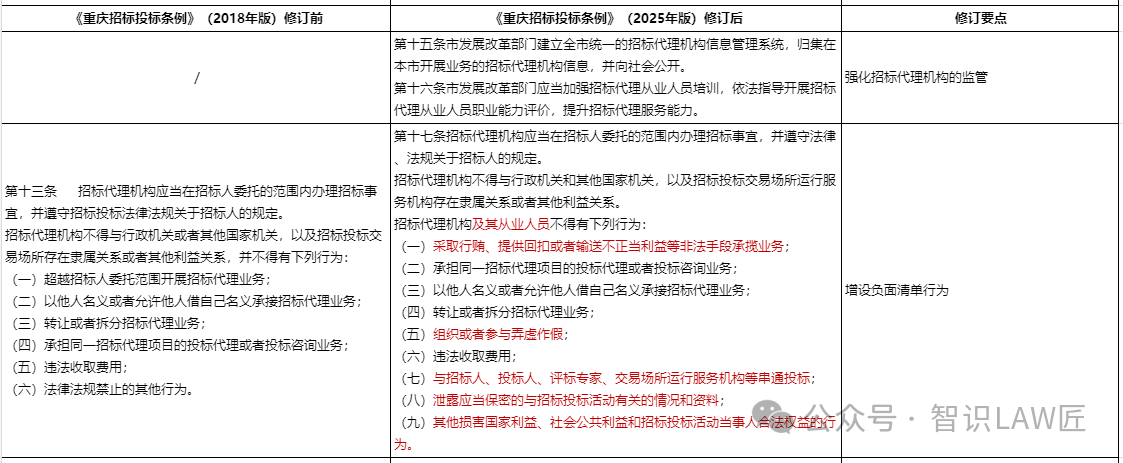 修订要点4:强化责任约束。原条例中仅对招标代理机构提出合规要求,本次修订扩展至“从业人员”,强化责任约束。