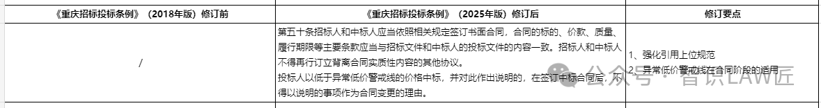 修订要点2:异常低价警戒线在合同阶段的适用。对于新规增加的异常低价警戒线机制,对于投标人提供说明且评标委员会未否决其投标的,新规在投标完成时提出新的要求,即投标人不得再以说明事项作为合同变更的理由,防止中标人利用低价说明进行事后合同变更,从而避免恶意低价竞标者扰乱市场秩序。