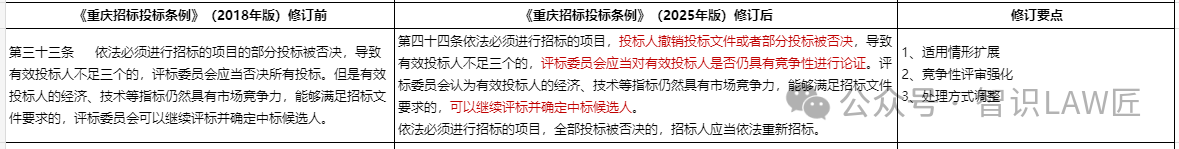 修订要点2:竞争性评审强化。原条例中对于有效投标不足三个时,是否进行竞争性评审并无强制性要求,新规明确要求评标委员会必须对剩余投标的竞争性进行专门论证,即经济、技术等指标是否仍具有市场竞争力。