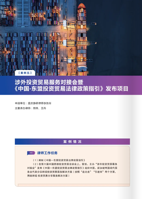 活动现场,市司法局与市商务委联合评选出的重庆市涉外法律服务十大典型案例与十大涉外法律服务产品正式发布。重庆静昇律师事务所主办的“涉外投资贸易服务对接会暨《中国 - 东盟投资贸易法律政策指引》发布项目”脱颖而出,成功获选涉外法律服务十大典型案例