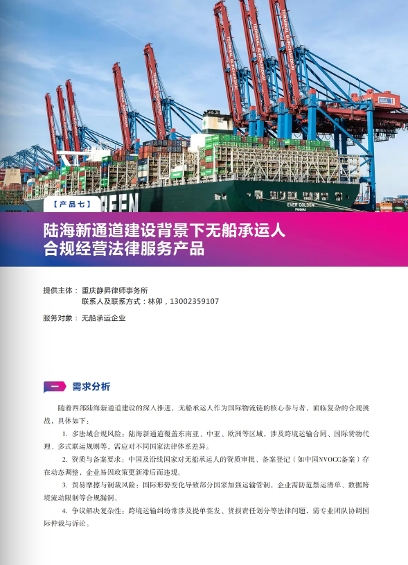 与此同时,重庆静昇律师事务所出品的“陆海新通道建设背景下无船承运人合规经营法律服务产品”也成功入选十大涉外法律服务产品。该产品紧密围绕陆海新通道建设这一国家战略,针对无船承运人在业务运营过程中面临的复杂法律问题,提供了一套系统、专业的合规经营解决方案,能有效帮助企业规范经营行为,降低法律风险,为陆海新通道的高质量发展提供了坚实的法律保障。
