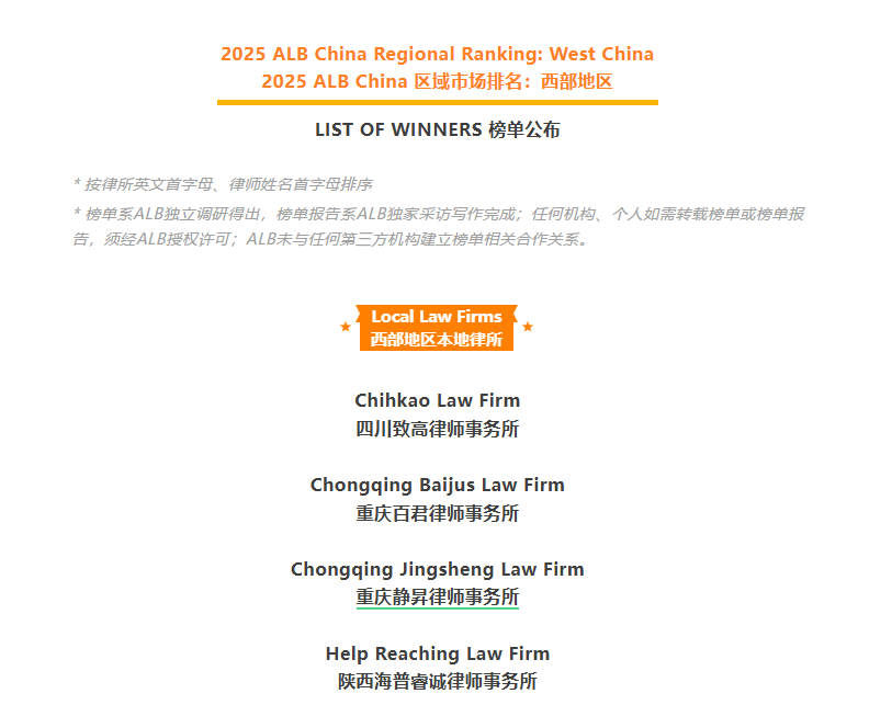 7月18日,知名法律媒体《亚洲法律杂志》(Asian Legal Business)公布了“2025 ALB China 区域市场排名:西部地区律所、律师新星、客户首选律师”榜单。重庆静昇律师事务所凭借良好的口碑和卓越的业绩,连续两年荣登“西部地区律所”榜单。