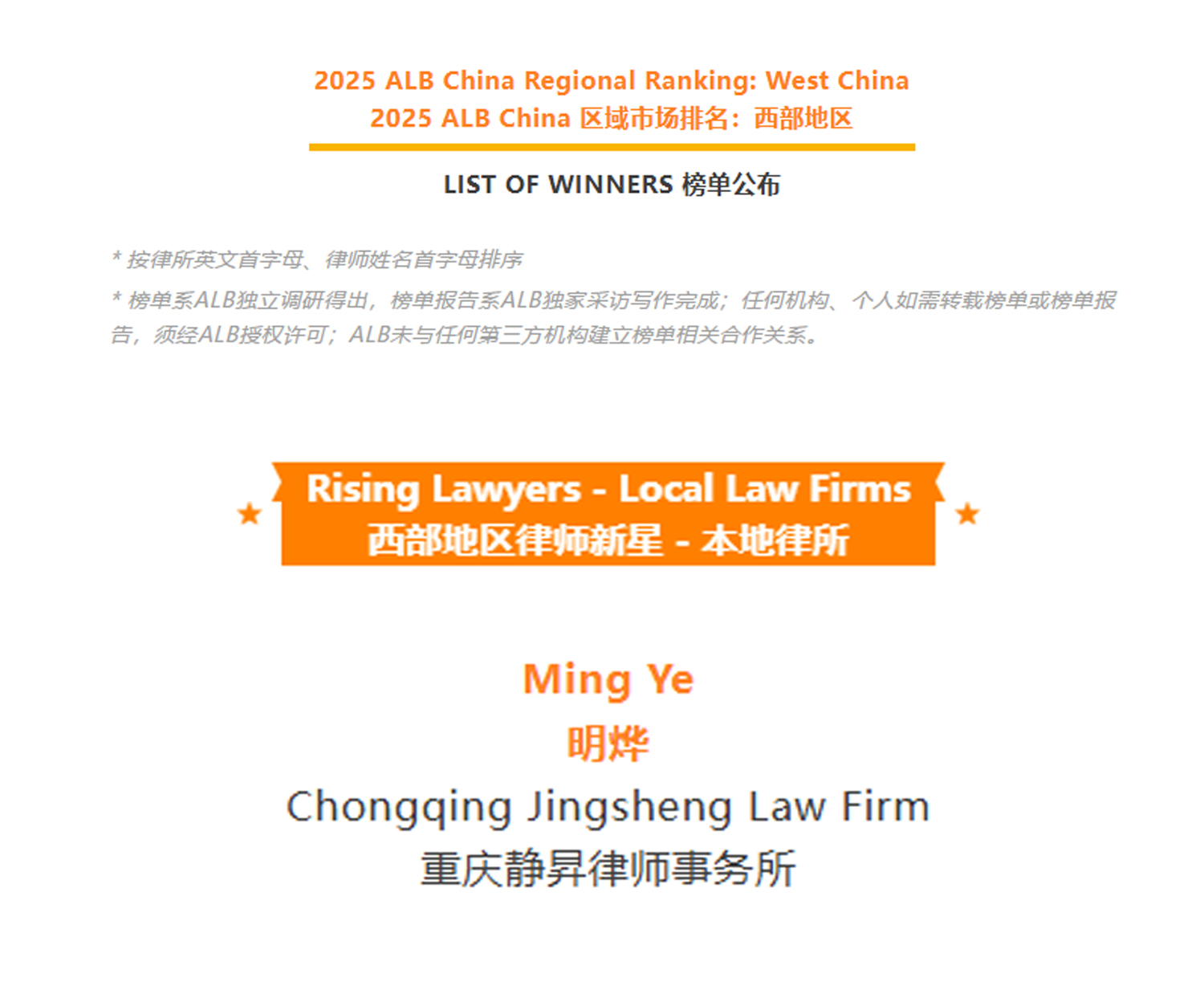 7月18日,全球知名法律媒体《亚洲法律杂志》(Asian Legal Business)正式发布了“2025 ALB China 区域市场排名:西部地区律所、律师新星、客户首选律师”榜单。在这份备受瞩目的榜单中,重庆静昇律师事务所高级合伙人明烨律师凭借其卓越的专业能力和杰出的法律服务表现,荣获“西部地区律师新星”称号。