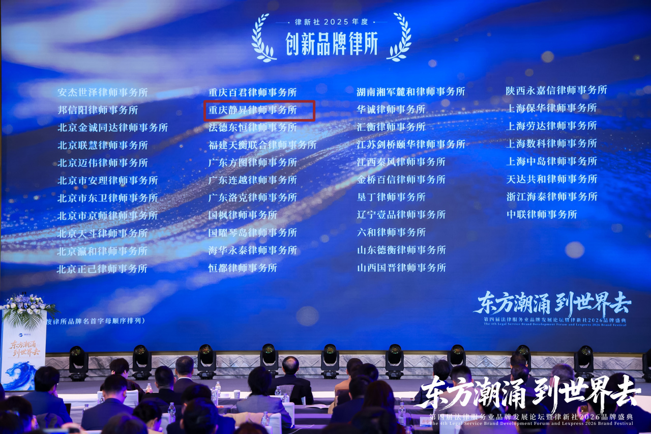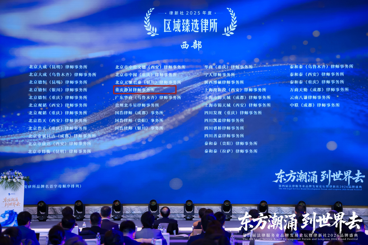 3月14日,由律新社主办的“东方潮涌 到世界去”第四届法律服务业品牌发展论坛暨律新社2026品牌盛典隆重举行!凭借出色的品牌打造、卓越的专业实力以及行业影响力,重庆静昇律师事务所一举斩获"律新社2025年度创新品牌律所"与"2025年度区域臻选律所(西部)"两项重磅荣誉。