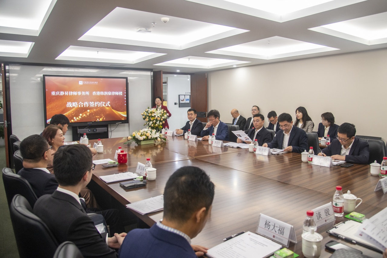 11月7日上午10:00,重庆静昇律师事务所与香港韩润燊律师楼战略合作签约仪式在重庆静昇律师事务所会议室正式举行。重庆市司法局党委委员、政治部主任、市律师行业党委书记李友生,渝中区政府副区长、党组成员赵意伦,重庆市司法局律师工作处处长、市律师行业党委副书记高弘倞,渝中区政府办公室副主任刘畅,渝中区司法局党委书记、局长刘吉彦,重庆市司法局律师工作处副处长、市律师协会秘书长许登,市司法局律师工作处一级主任科员田蛟,渝中区商务委企业服务科科长周福杰等领导与嘉宾到场见证,对双方的战略合作给予了高度的重视和支持。香港方面,韩润燊律师楼管理合伙人黄显舜,香港大律师吴嘉康,韩润燊律师楼注册海外律师杨大福,新加坡银行私人银行家谈骏先生到场参加仪式,重庆静昇律师事务所创始合伙人、主任彭静携静昇全体成员出席仪式。